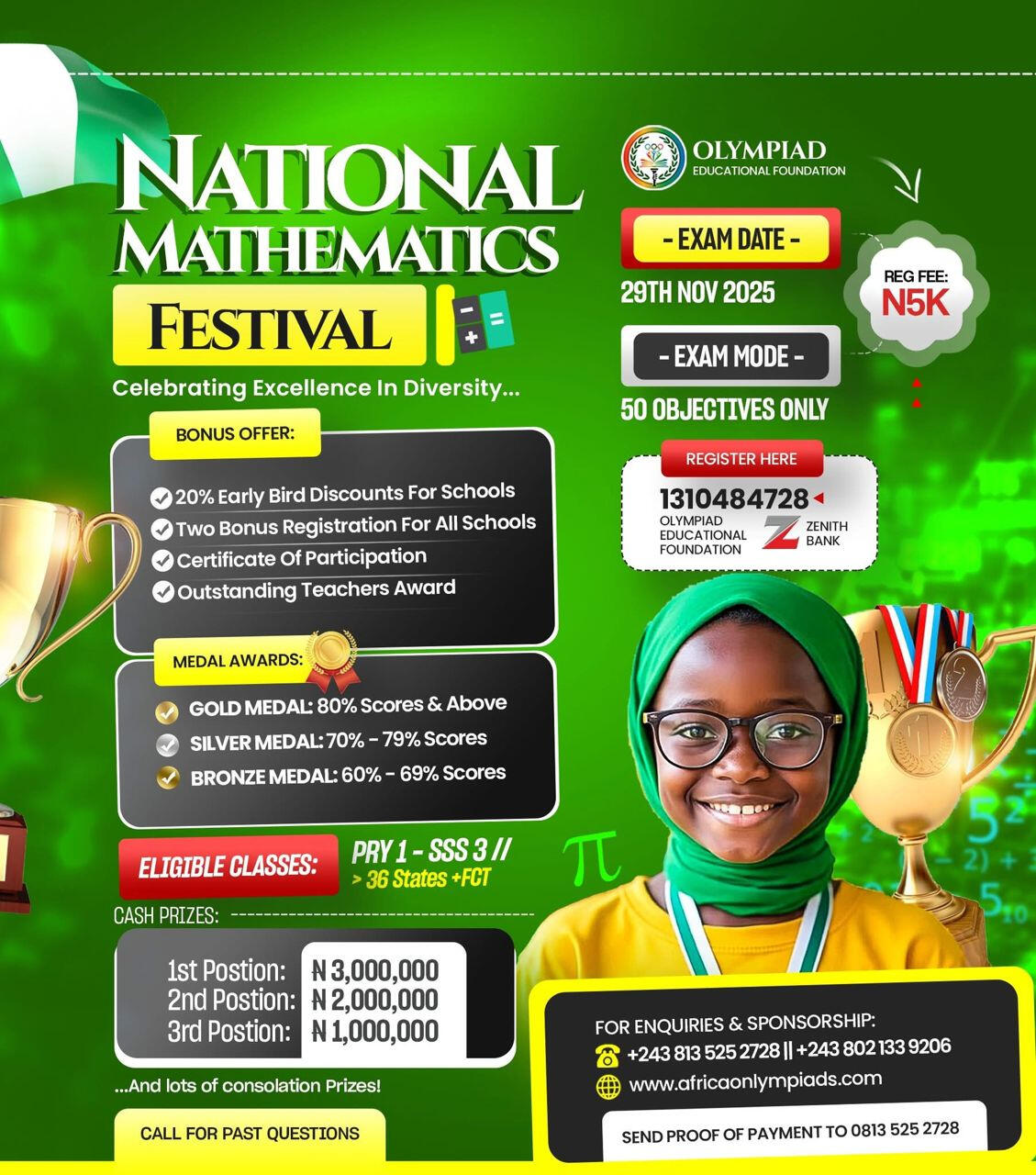 The National Mathematics Festival is a ground breaking initiative that seeks to promote mathematical excellence among schools across Nigeria.Our mission is to ignite and nurture learners' passion for mathematics, driving academic excellence and future success.By encouraging learners to excel in mathematics, we aim to cultivate a new generation of problem-solvers, thinkers and innovators who will shape Nigeria's future.NMF features a standardized Mathematics examination where schools compete to earn Medals for their respective States. The top-performing Schools, determined by the total number of medals won, will be crowned champions.